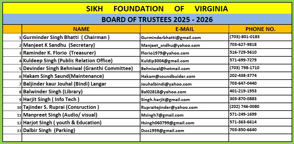 Sikh Foundation of Virginia's current version of the Constitution and Bylaws are dated March 16, 2025. A signed copy is available below for downloaded.