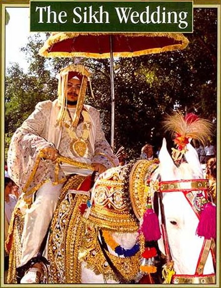 - Introduction of Groom’s and Bride’s Families (Milny): The bride’s family and friends wait in an open area outside of the ceremony hall as the Groom’s wedding party (Baraat) arrives. Usually the Groom rides a decorated horse while the baraat members are singing and dancing as they approach the awaiting bride’s party. At this point the groom dismounts his horse, as the bride’s party sings a welcoming Hymn, “Hum Ghar Sajan Aiye”. This is followed by an Ardas (prayer) by the Priest. After the Ardas, the groom’s father is introduced to the bride’s father. They greet each other and exchange pleasantries and some gifts. This follows similar introduction of other members of
